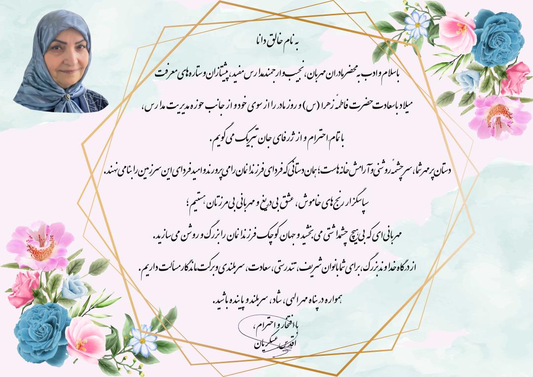 میلاد باسعادت حضرت فاطمهٔ زهرا (س) و روز مادر را از سوی خود و از جانب حوزه مدیریت مدارس، با تمامِ احترام و از ژرفای جان تبریک میگویم.